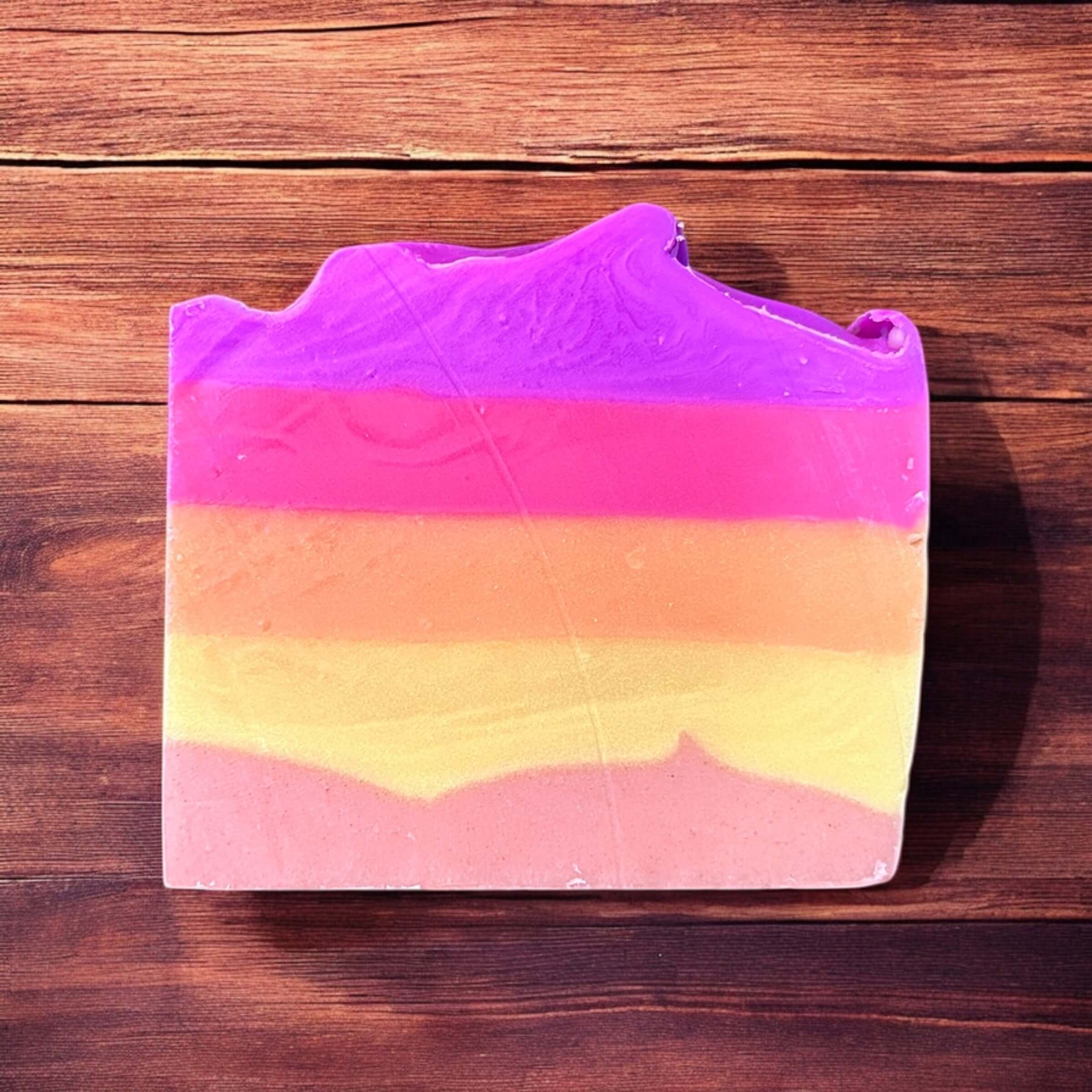 Moab at daybreak, in color. Miles from Nowhere captures that desert moment when sand blazes from gold to ember and the sky climbs through yellow → orange → red → violet. The bar mirrors the scene—micas layered like sunrise strata, a pinch of real Utah sand for a whisper-fine polish, and a creamy lather that feels as calm as first light on red rock.